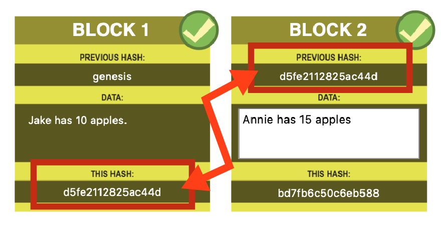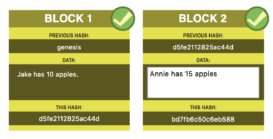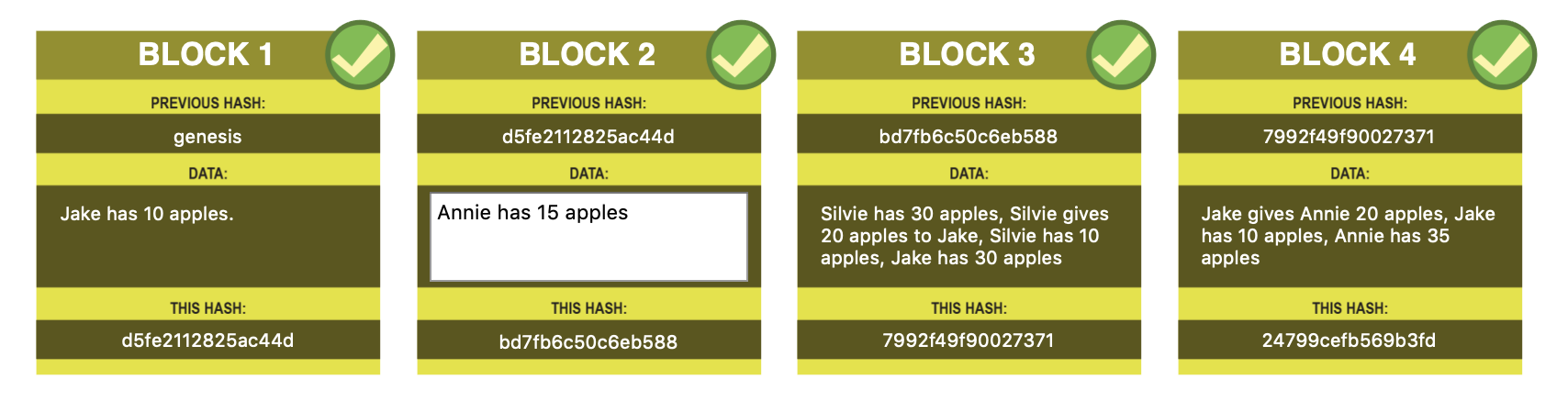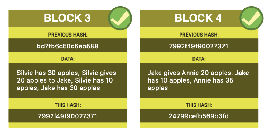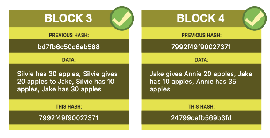 Here is a chain with 4 blocks. Each block is an update to the previous block’s information - a snapshot in time order. In this case, a ledger of apple ownership.
