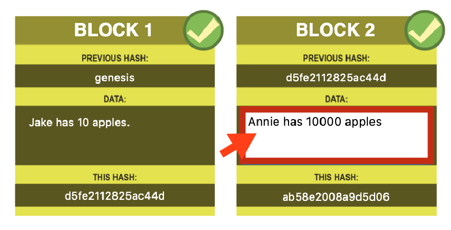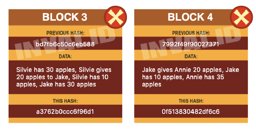 If data is altered in a block, then its hash and all following block hashes would change — and therefore become invalidated.
